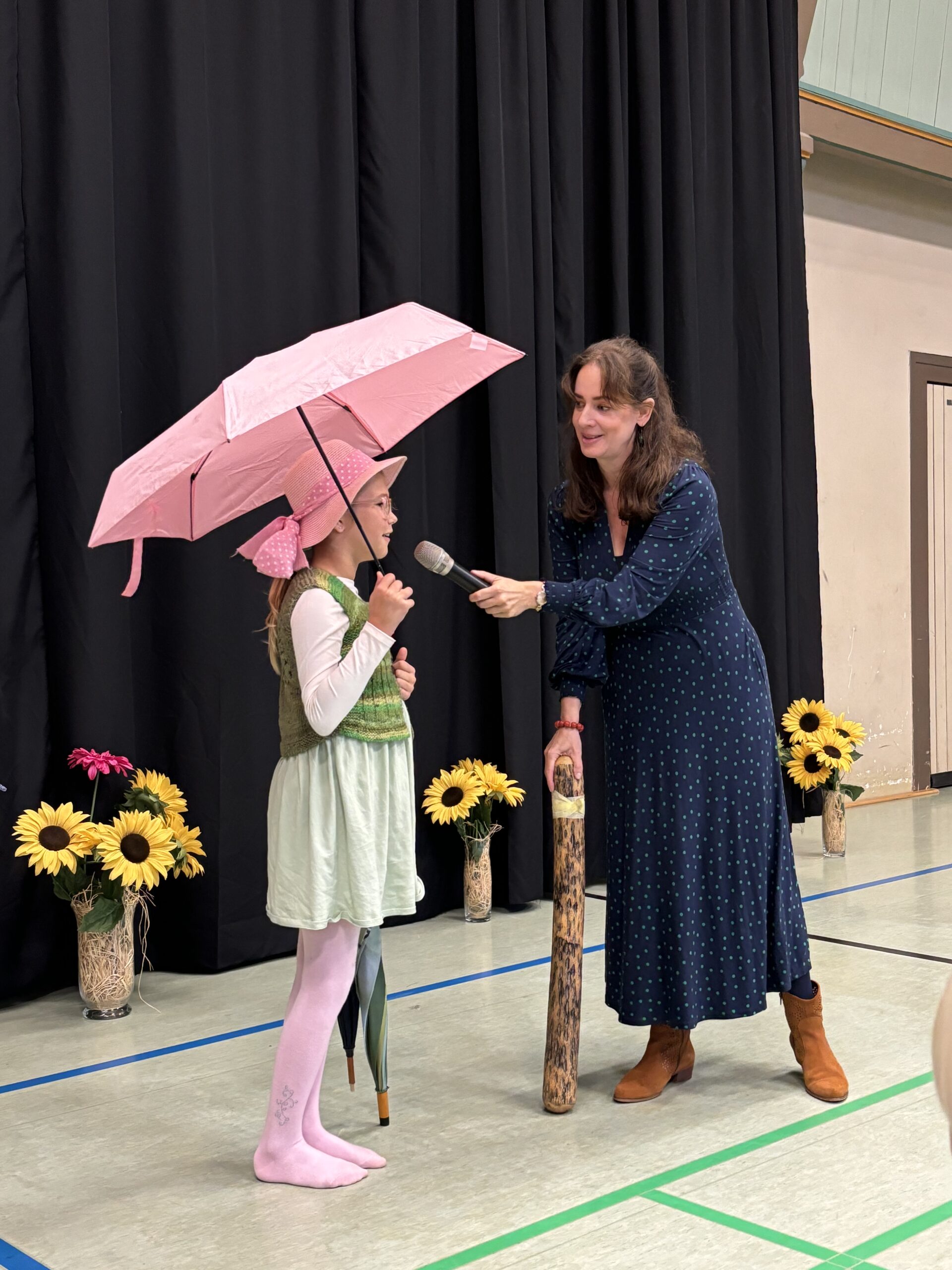 Die drei ersten Klassen trugen das Lied „Summ, summ, summ, Bienchen summ herum“ vor und umrahmten es mit gebastelten Bienen und der als Biene verkleideten Zahra, die zwischen den Strophen mit Kazoobegleitung herumflog.
