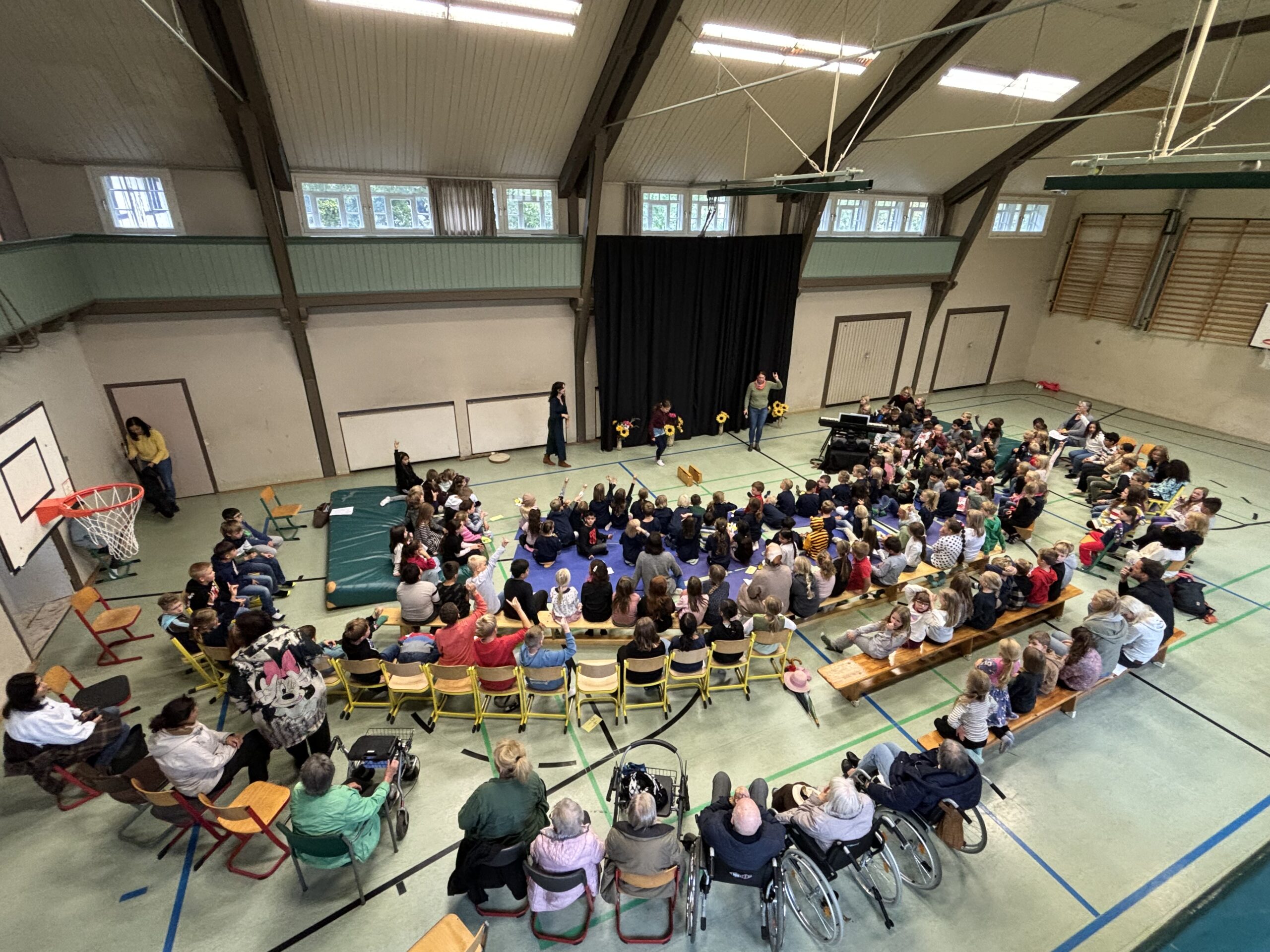 Alle Schülerinnen und Schüler der Grundschule versammelten sich in der kleinen Turnhalle, um sich gemeinsam singend und tanzend in die Herbstferien zu verabschieden.