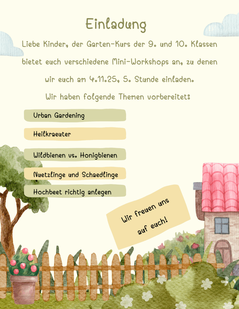 Was ist eigentlich der Unterschied zwischen Honig- und Wildbienen? Welche Insekten sind echte Gartenhelfer und welche richten eher Schaden an? Wie schichtet man ein Hochbeet richtig? Wozu sind Heilkräuter gut und was ist eigentlich „Urban Gardening“? All diesen spannenden Fragen gingen die vierten Klassen unserer GHS am 4. November 2025 auf den Grund. Der WPK Garten der neunten und zehnten Klassen hatte die jüngeren Schülerinnen und Schüler zu fünf liebevoll vorbereiteten Mini-Workshops eingeladen. Die älteren Mitschülerinnen und Mitschüler hatten Präsentationen und anschauliche Plakate gestaltet und boten kreative Mitmachaktionen rund um die Themen Garten, Pflanzen und Nachhaltigkeit an.