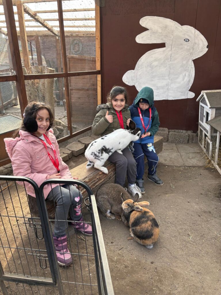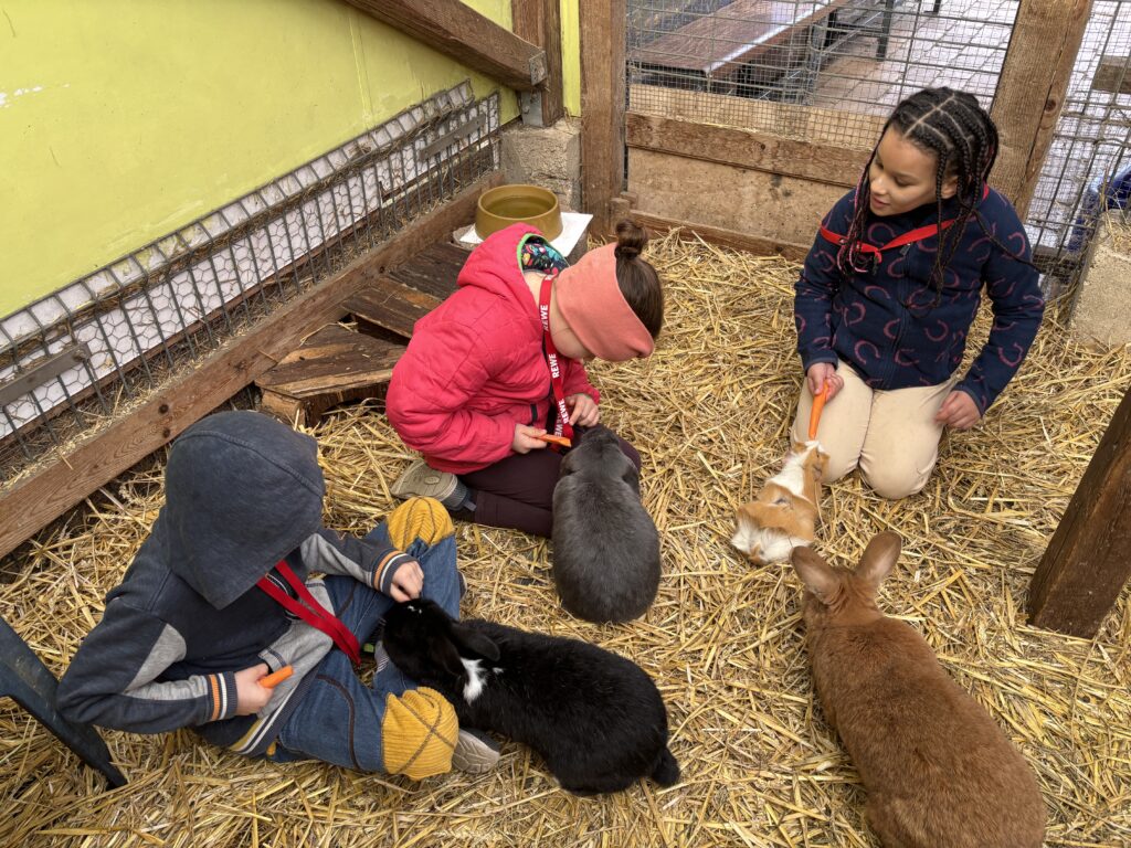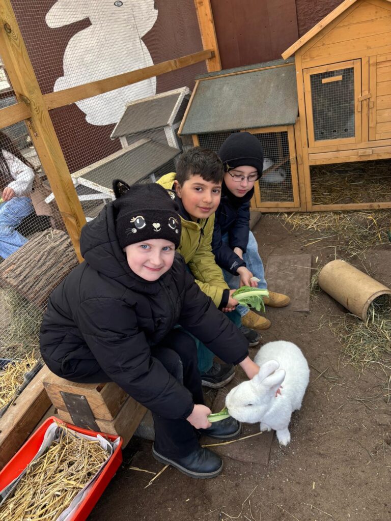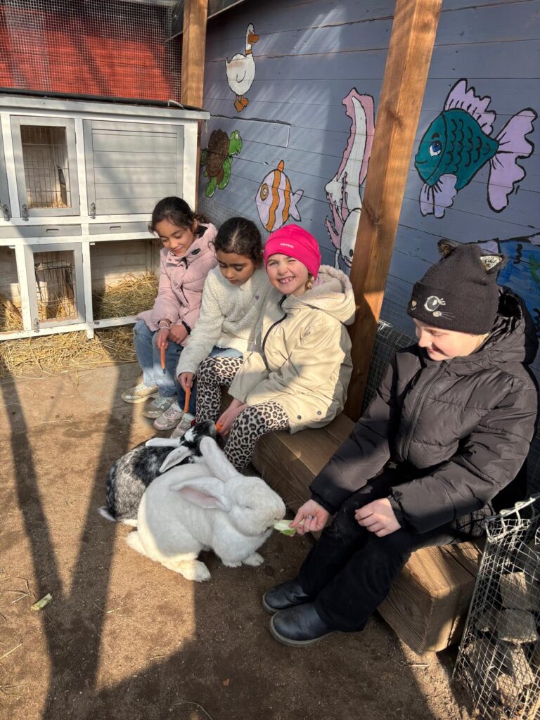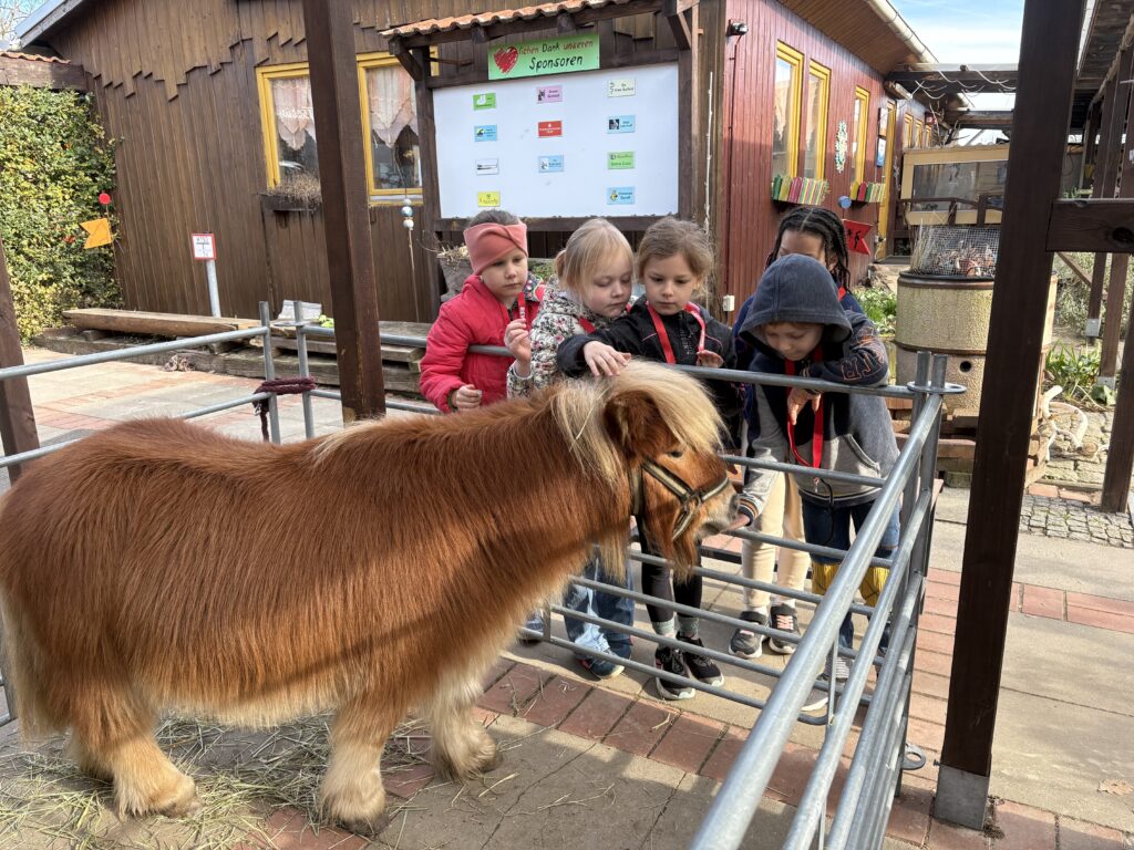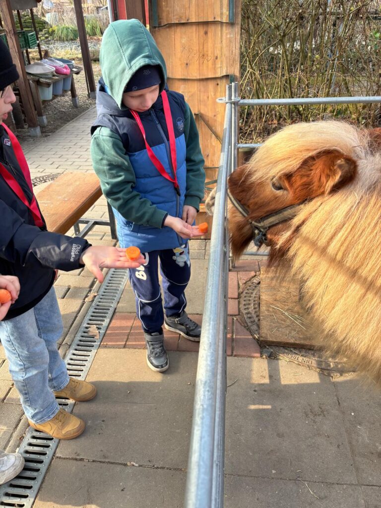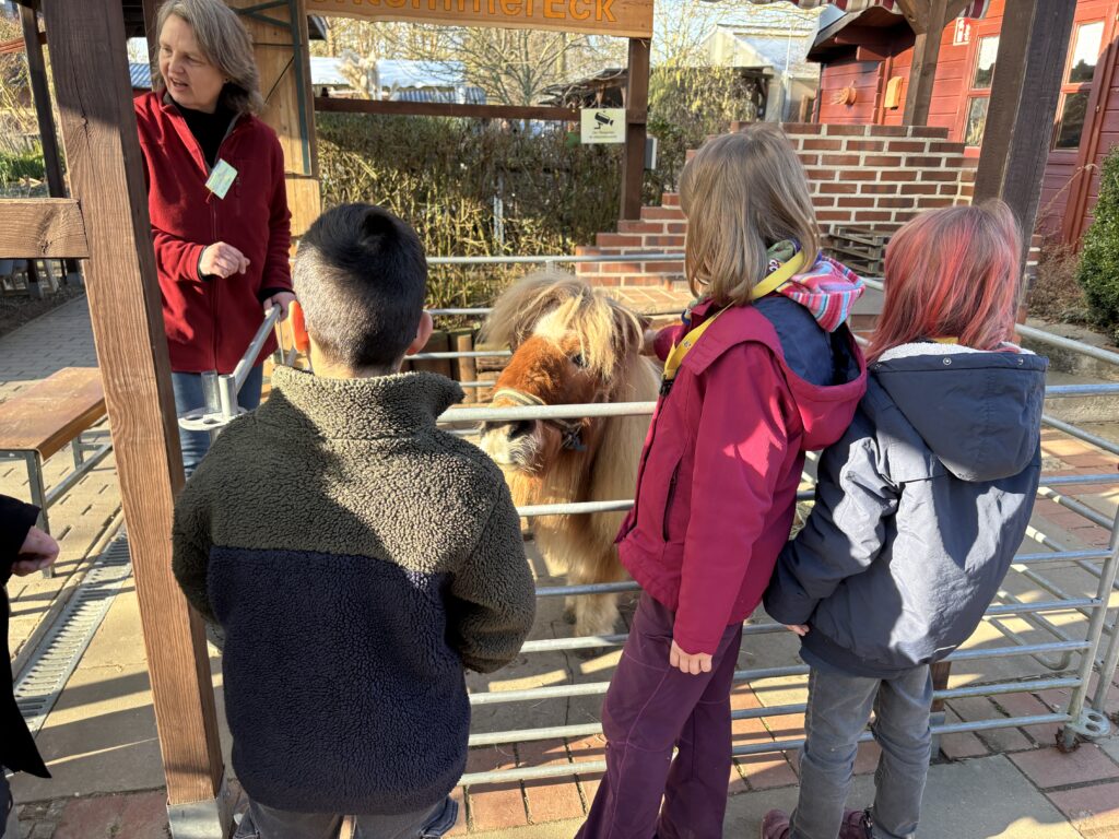 Dort erwartete die Kinder ein tolles Programm zum Thema Haustiere: Unterricht im Freien, eine wirklich tolle Abwechslung zum normalen Schulalltag. Bei schönstem Wetter mit fast frühlingshaften Temperaturen erfuhren die Kinder vieles über die artgerechte Haltung von Ponys, Meerschweinen und Kaninchen sowie einer Hausente und Haushühnern. Neben den vielen Informationen durften die Kinder natürlich das Pony „Nuri“ streicheln, kuscheln und füttern. Außerdem durften sie erfahren, wie es sich anfühlt, die Pommernente „Pommes“ sowie die Hühner anzufassen. Die Meerschweinchen und Kaninchen wurden zudem ausgiebig mit Möhren gefüttert. Nach dem Programm, welches die Mitarbeiterinnen und Mitarbeiter des Ökogarten ganz wunderbar durchführten, konnten die Kinder sich vor Ort selbstständig umsehen. Einige mutige Entdecker wagten einen Blick ins Vivarium, in dem es unter anderem Schlangen und Spinne zu sehen gab, andere schauten sich die Vögel an oder beschäftigten sich weiter mit den Tieren, die sie zuvor ausgiebig kennengelernt haben.